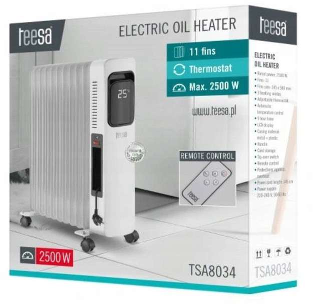 Модель TSA8034 являє собою 11-ребристий пристрій потужністю 2500 Вт і системою з трьох масляних каналів, які дозволяють швидко нагріти масло в ребрах і наповнити теплом приміщення до 25 м2. Триступеневе регулювання температури здійснюється за допомогою ручки термостата. Завдяки цьому його температуру можна регулювати під уподобання користувача.